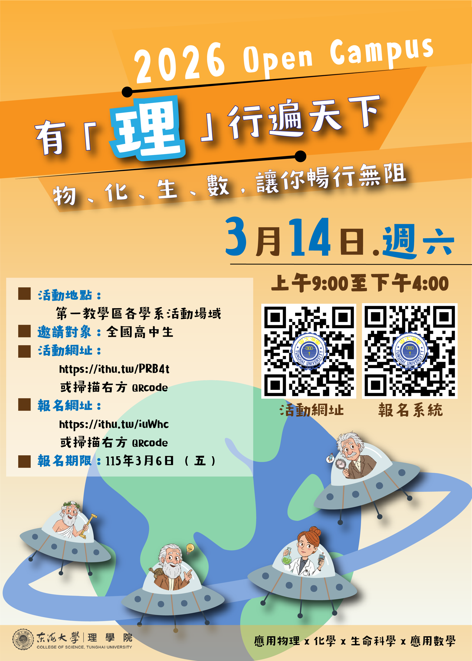 | 公告主旨 | 東海大學理學院理學院辦理「2026年Open Campus 有『理』行遍天下,物.化.生.數.讓你暢行無阻」活動 |