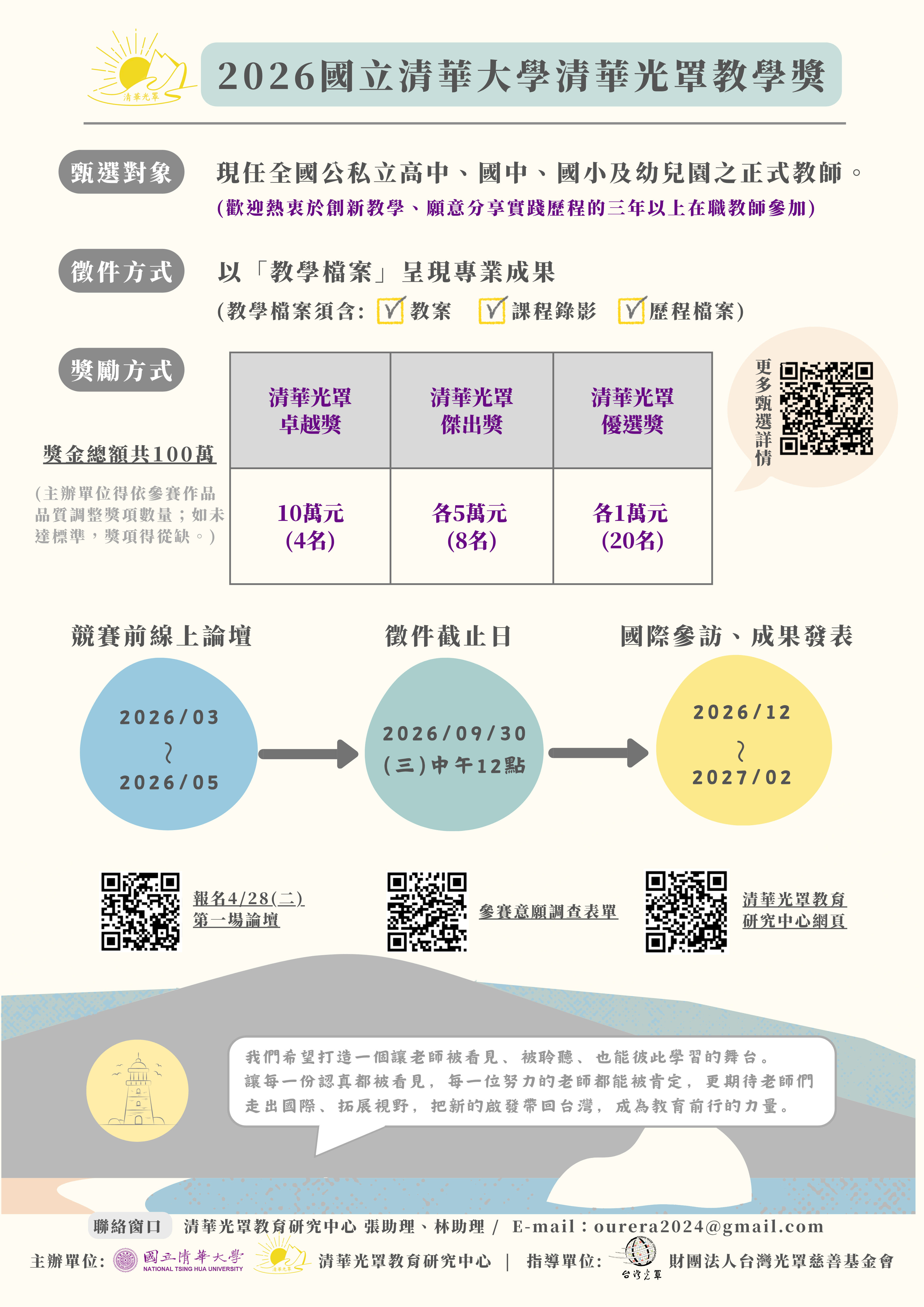 校園公告 公告主旨 「2026國立清華大學清華光罩教學獎」甄選 發佈日期 2026 年 4 月 24 日 發佈單位 高中教學組 公告類別 活動競賽 公告等級 轉知 點閱次數 31 公告內容 相關附件 「2026國立清華大學清華光罩教學獎」甄選 「2026國立清華大學清華光罩教學獎」甄選 檔案名稱檔案大小檔案格式下載「2026國立清華大學清華光罩教學獎」甄選.png1.65 MB新視窗開啟檔案 「2026國立清華大學清華光罩教學獎」甄選.png 【2026-04-24】「女神姿容-神獸再現特展中女性形象探究實作工作坊」108課綱跨領 ... 【2026-04-24】「115年度十二年課綱原住民族教育議題融入校訂課程推廣計畫」社 ...