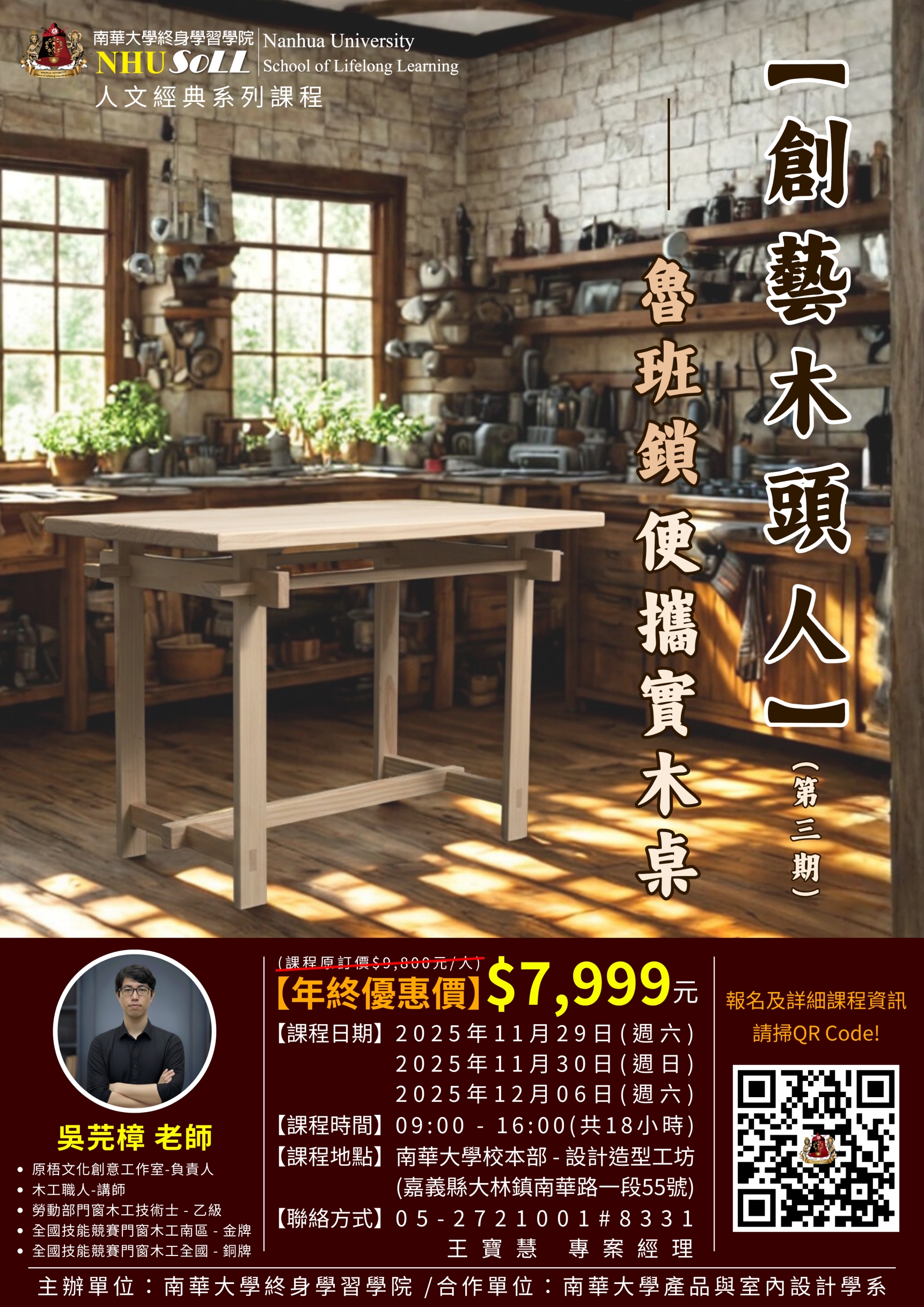 | 公告主旨 | 南華大學辦理人文經典系列【創藝木頭人】(第三期) 魯班鎖便擕實木桌課程 |