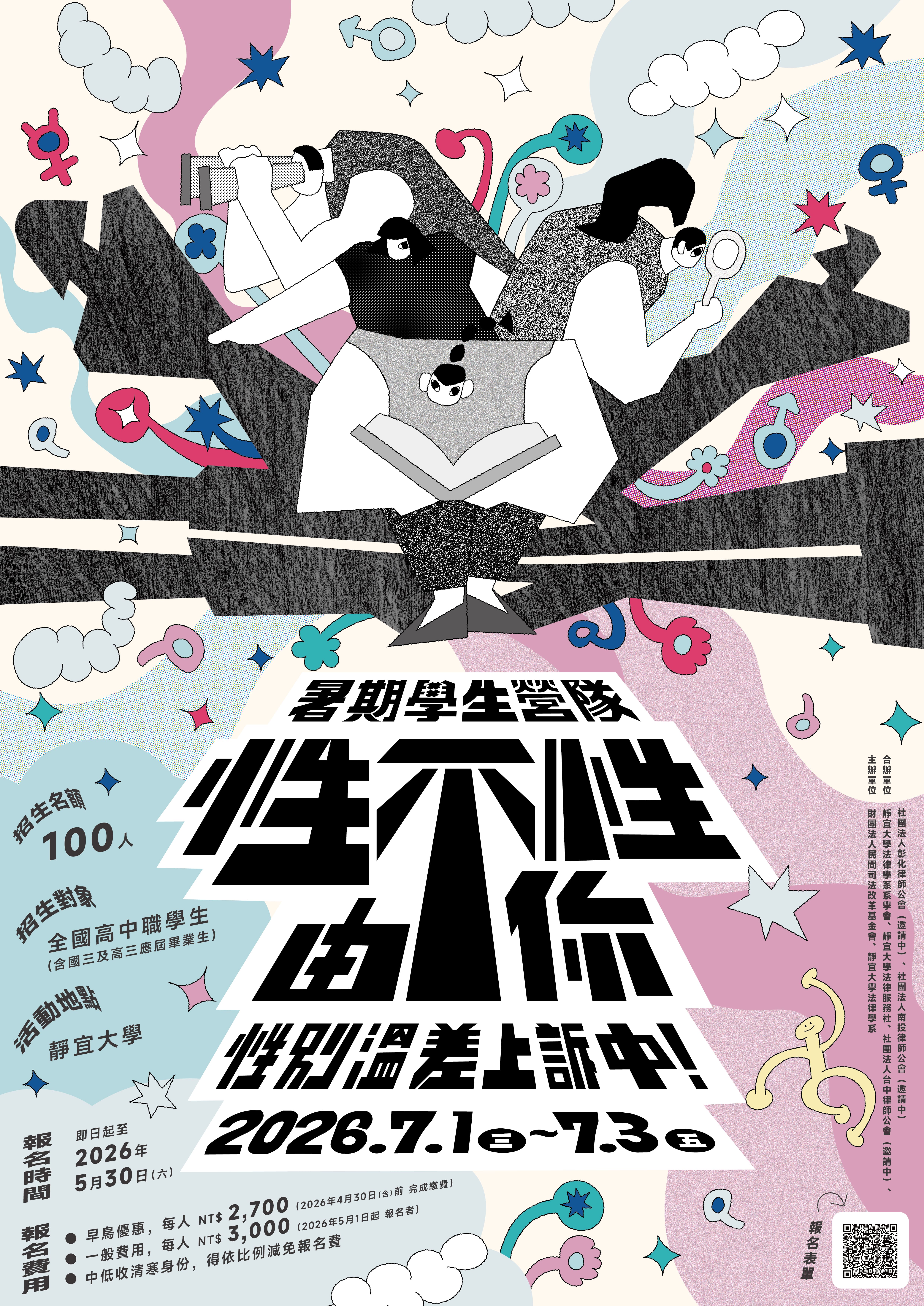 | 公告主旨 | 靜宜大學法律學系與財團法人民間司法改革基金會共同辦理暑期學生營隊【性不性由你—性別溫差上訴中!】 |