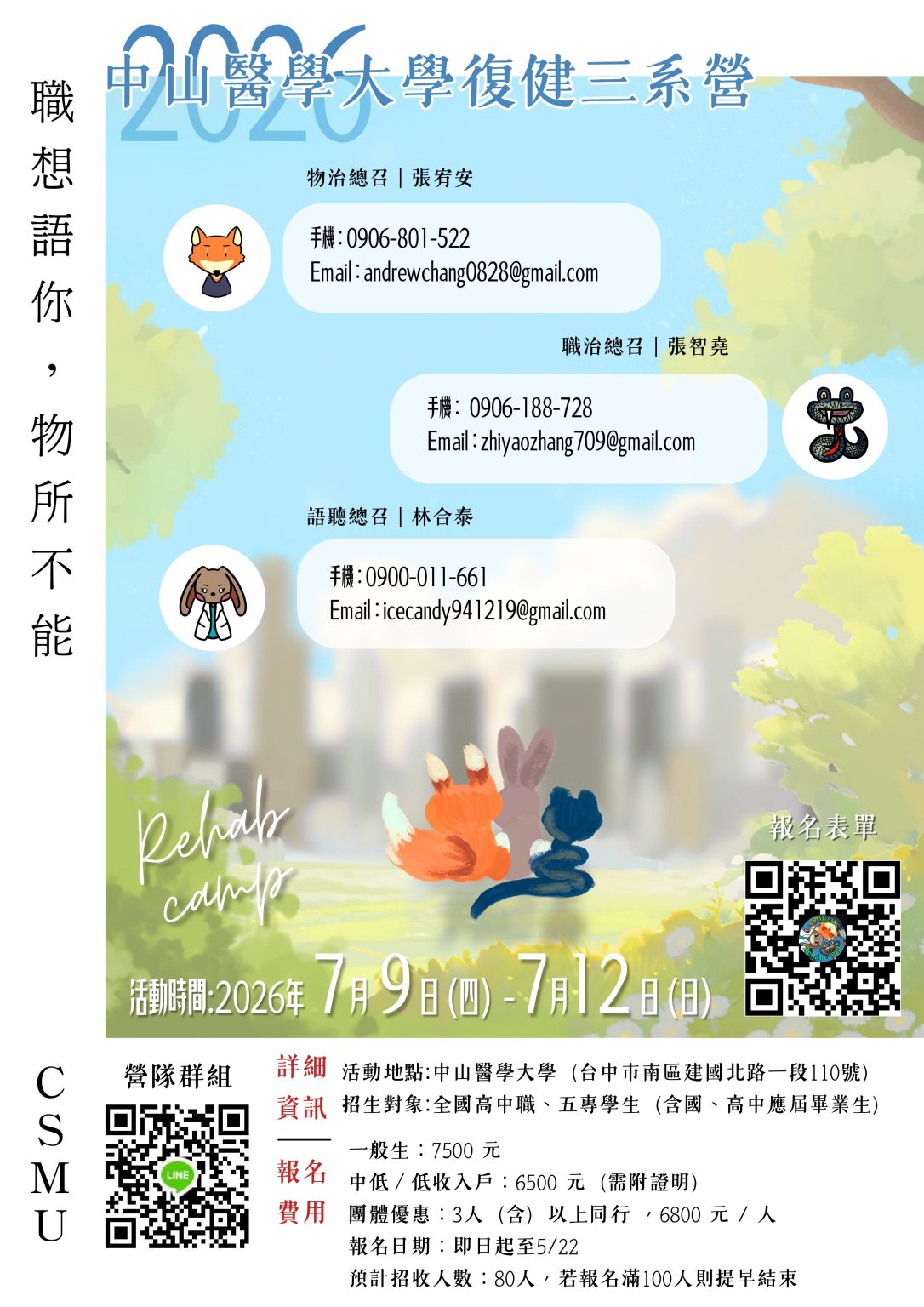 | 公告主旨 | 2026暑假營隊—中山醫學大學辦理2026年中山醫學大學復健三系營 |